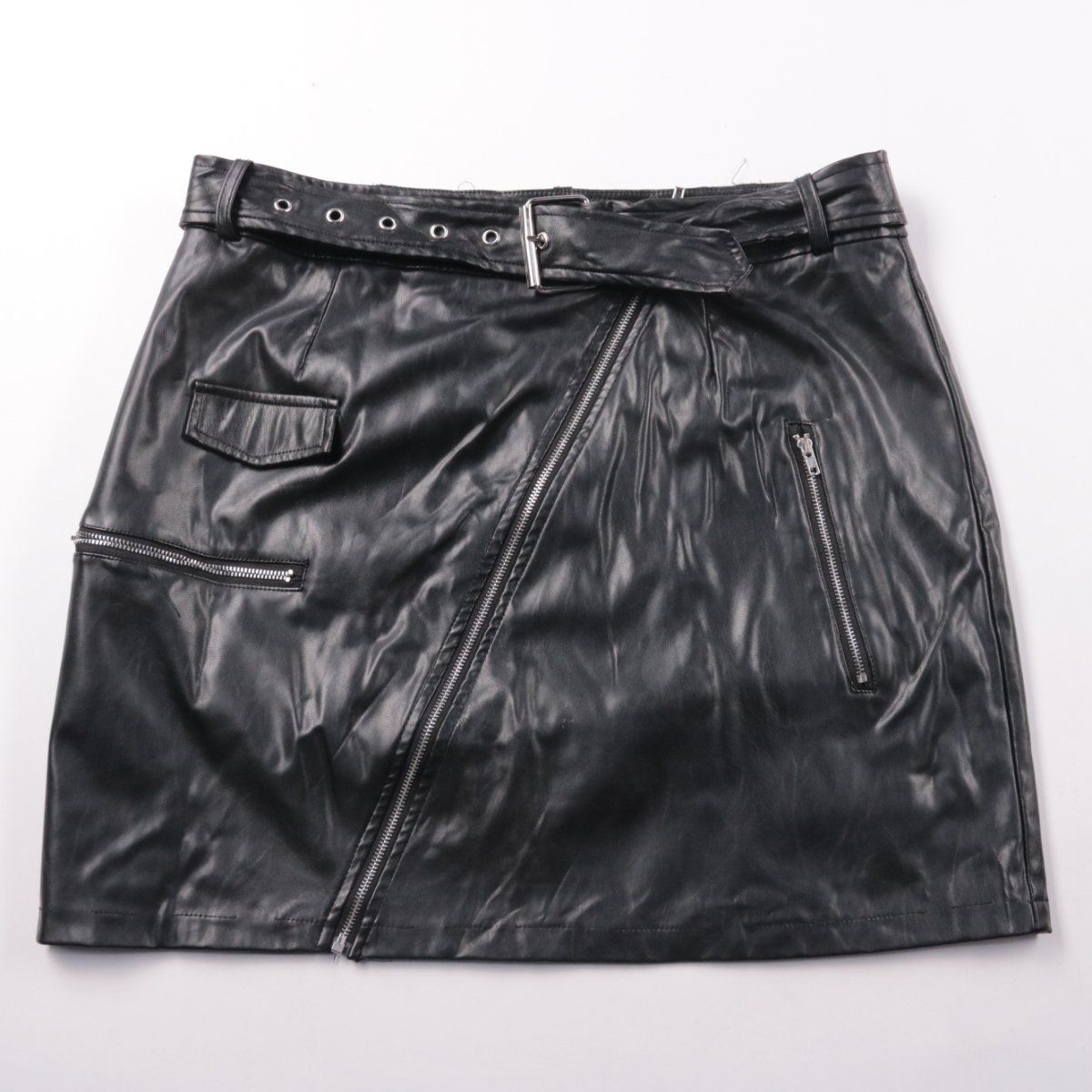 Юбка PrettyLittleThing из экокожи (покрытие полиуретан) с асимметричной молнией и поясом. Подойдёт для городских образов и вечеринок, хорошо сочетается с водолазкой или рубашкой и грубыми ботинками. Материал легко протирается влажной салфеткой, а молнии добавляют удобные акценты.
