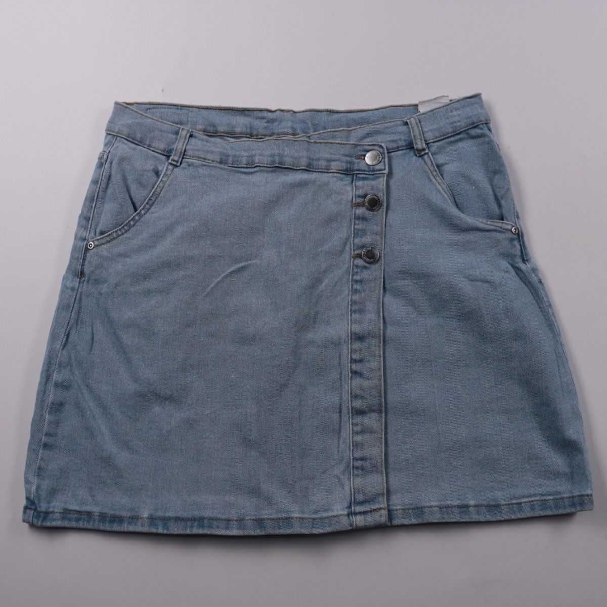Джинсовая юбка Page One светло-голубого цвета с застёжкой на пуговицы и карманами. Подойдёт для повседневных летних образов с футболками и кедами. Плотный деним хорошо держит форму и удобен в носке.