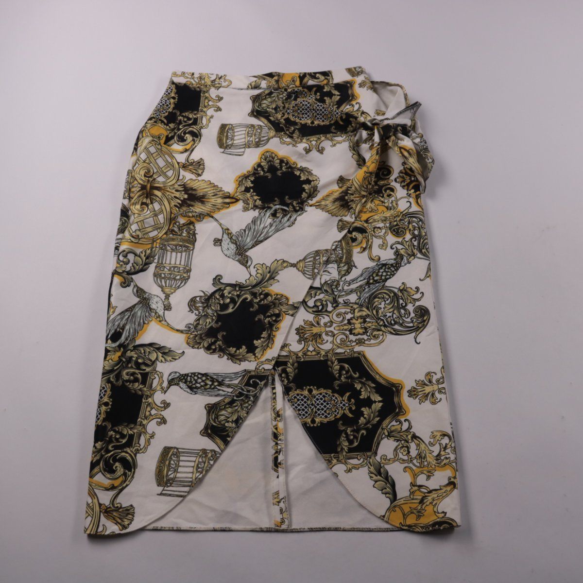 Юбка River Island с запахом и завязкой на талии, с барочным принтом в бело-чёрно-золотой гамме. Подойдёт для летних прогулок и отпускных образов, легко сочетать с однотонным верхом. Запах позволяет удобно регулировать посадку по талии.