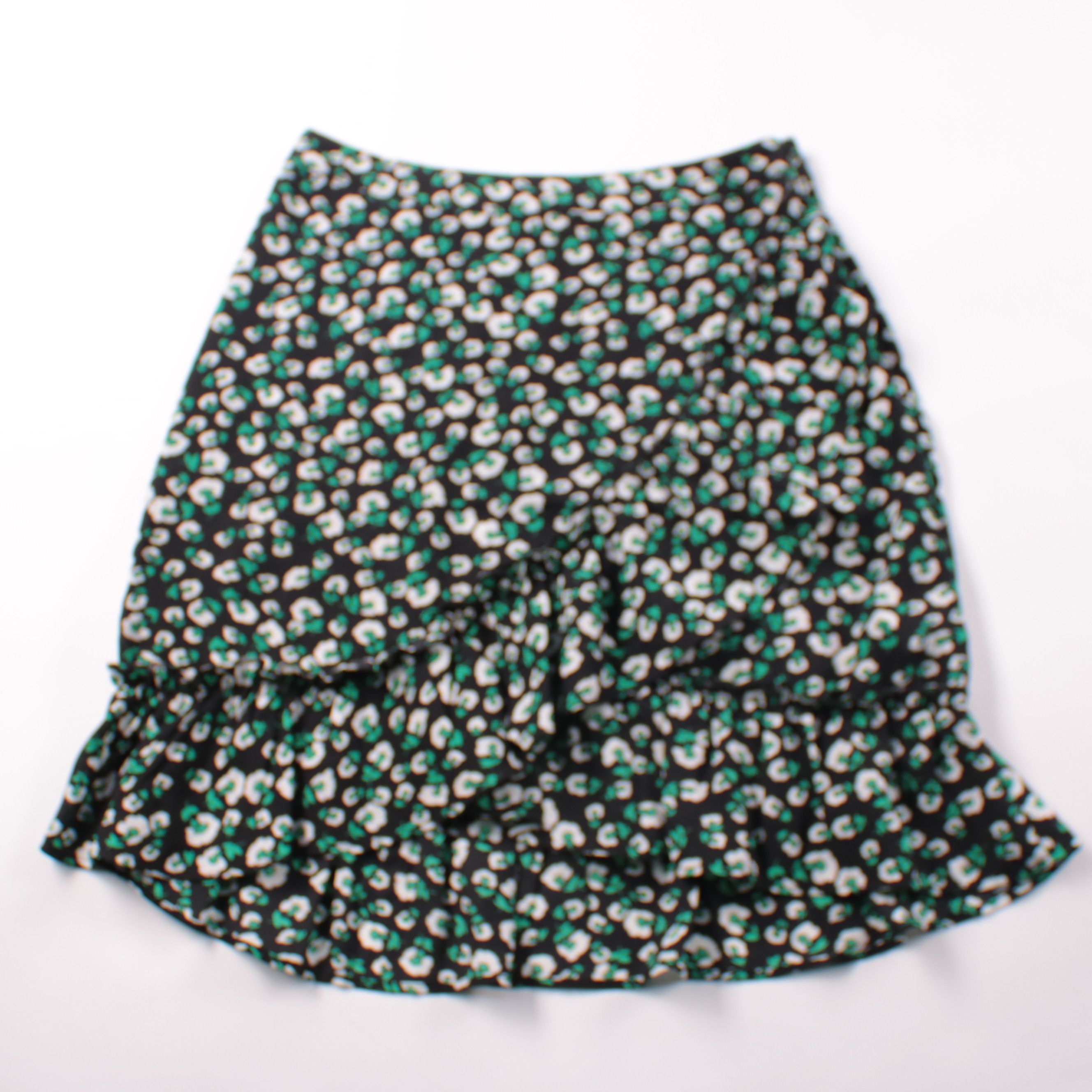 Женская юбка с ярусной оборкой и мелким зелёно-белым принтом на чёрном фоне. Подойдёт для повседневных летних образов и отпуска, хорошо смотрится с однотонными футболками и топами. Ткань из 100% полиэстера быстро сохнет и почти не мнётся.